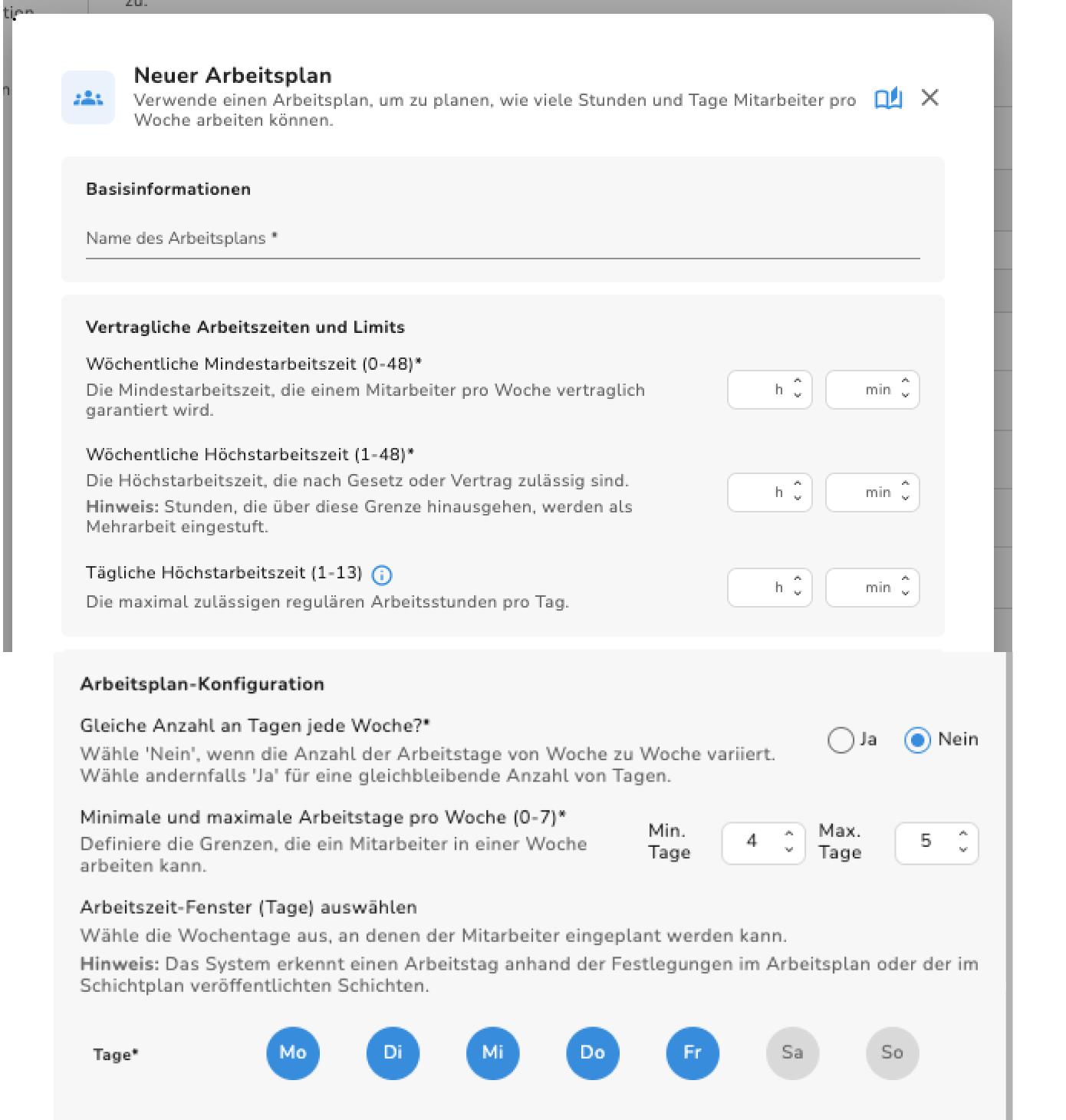 Arbeitspläne definieren die Mindest- und Höchstarbeitszeiten und die Arbeitstage der Mitarbeiter, sodass das System die Sollstunden, die Iststunden und die Mehrarbeit für jedes Beschäftigungsverhältnis genau erfassen kann.