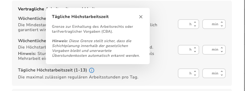 Gib die maximal zulässige Anzahl an Stunden pro Woche an. Jede erfasste Zeit über diesem Limit wird als Mehrarbeit eingestuft.