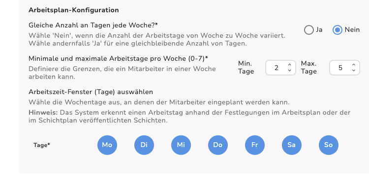 Minimale und maximale Arbeitstage pro Woche (0-7)* (Pflichtfeld)