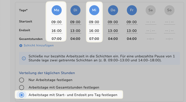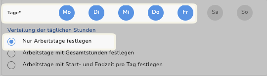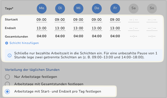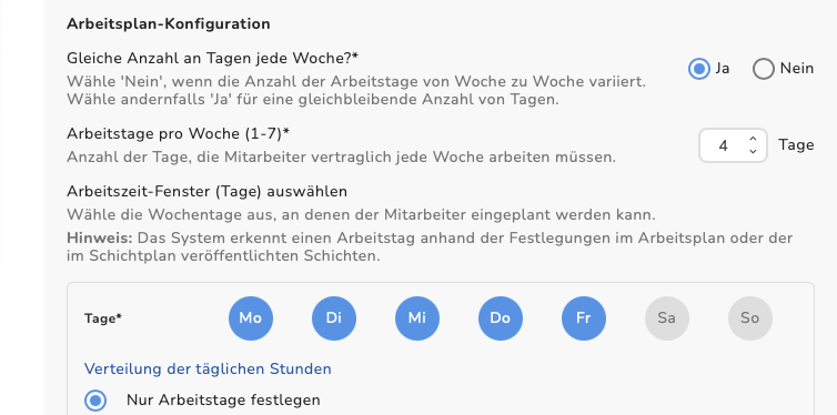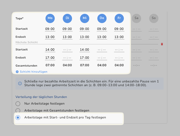 Wenn Du Ja für die gleiche Anzahl an Tagen pro Woche ausgewählt und die Tage* festgelegt hast, kannst Du verschiedene Optionen für die tägliche Stundenverteilung wählen.