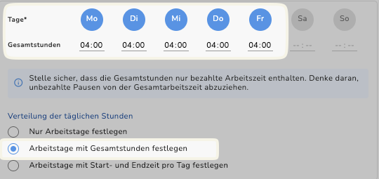 Option 2: Arbeitstage mit Gesamtstunden festlegen