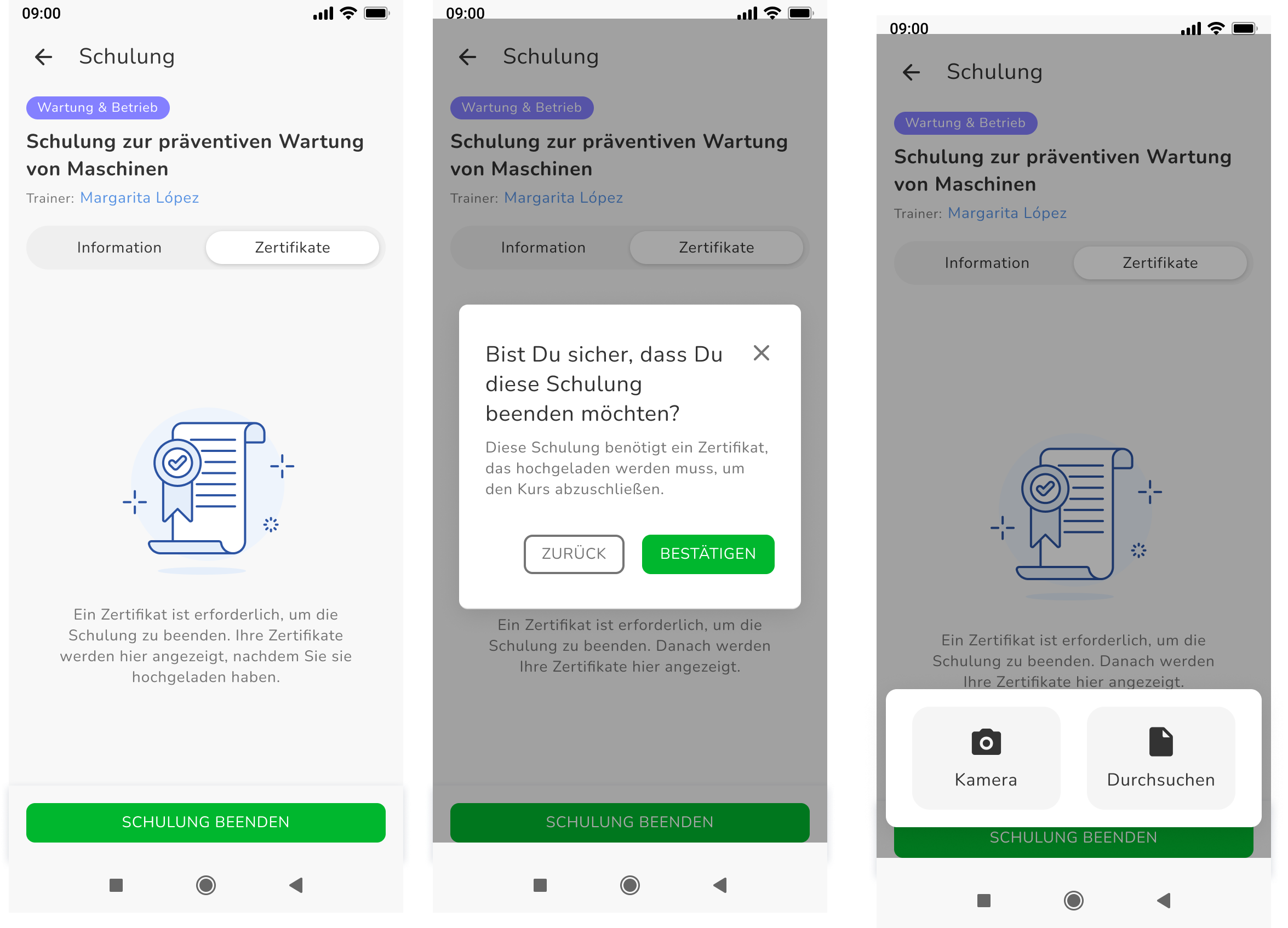 - ein Zertifikat nach Abschluss einer Schulung hochladen