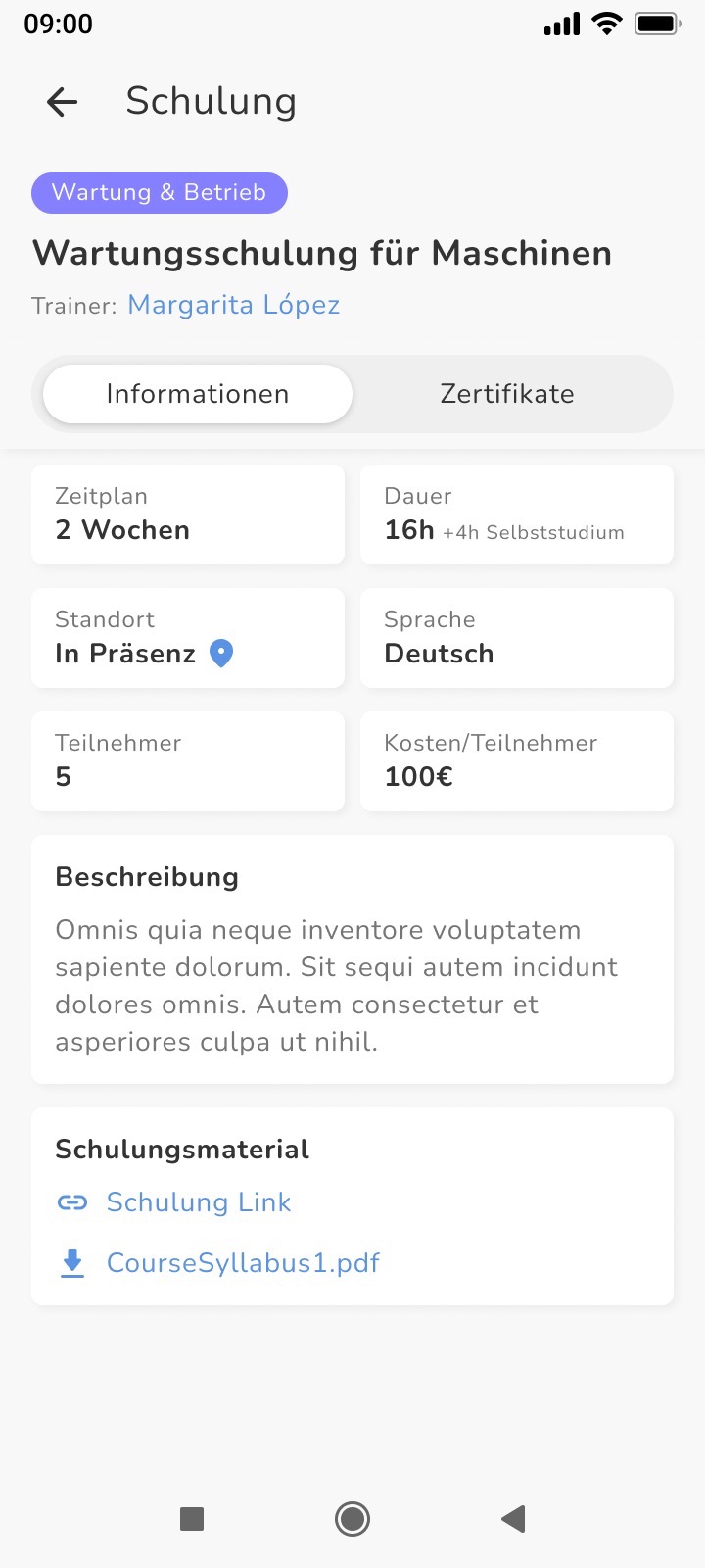 Detailansicht der Schulung: Mitarbeiter sehen alle Details, einschließlich Zeitplan, Dauer, Materialien und mehr
