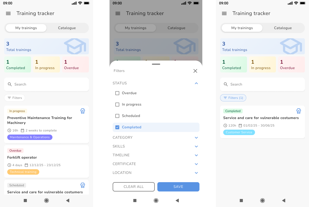 - Klicke auf die Filter unter der Suchleiste, um nach Status, Kategorie, Fähigkeiten und mehr zu filtern oder suche über die Suchleiste nach dem Namen einer Schulung