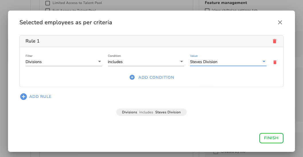 - Click Selected employees by criteria for a more restricted access for example for an employee handling the shift plan for one team via a custom profile, you can choose and define the criteria(s) for this profile