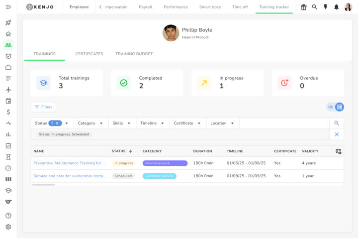 • Find the STATUS column to see whether the training is scheduled, in progress, overdue or completed