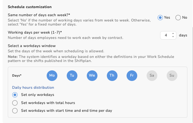 When you selected Yes for the same number of days each week and selected the Days* You can choose different daily hour distribution options.