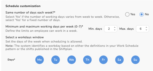 This configuration provides flexibility in choosing which specific days are worked each week.