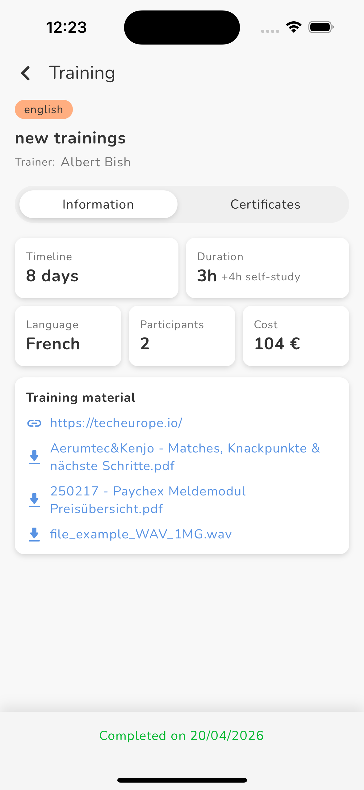 Trainings's detail view: Employees sees all details, including timeline, Duration, materials and more