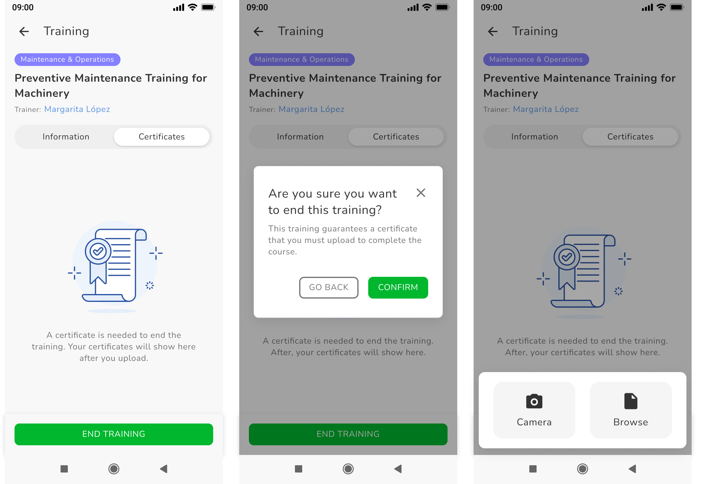 - upload a certificate after completing a training