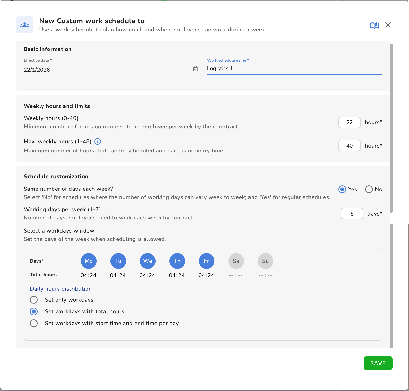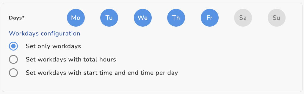 1. Définir uniquement les jours travaillés : Les heures sont (calculées automatiquement) et réparties de façon uniforme sur les jours travaillés sélectionnés. C’est la manière la plus rapide de créer un planning—sans saisie manuelle. (Exemple : 40 heures sur 5 jours = 8 heures par jour)