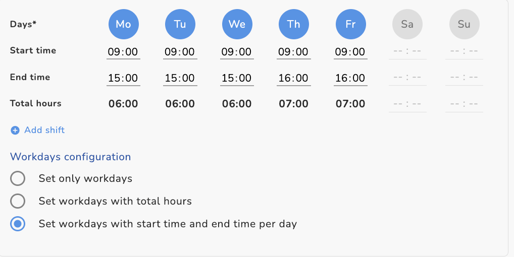 2. Définir les jours travaillés avec un total d’heures : Durée flexible (Flextime) : l’employeur définit manuellement une durée totale d’heures par jour. Les employés ont l’autonomie de choisir leurs propres heures de début et de fin, tant que l’objectif d’heures quotidiennes est atteint.
