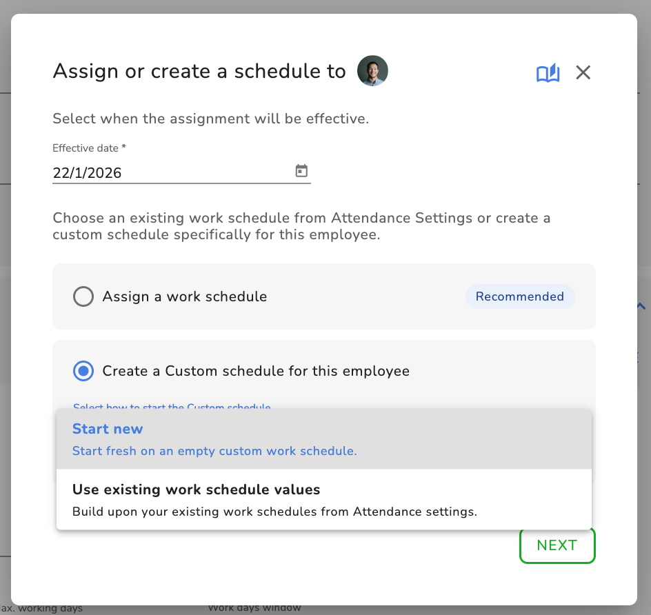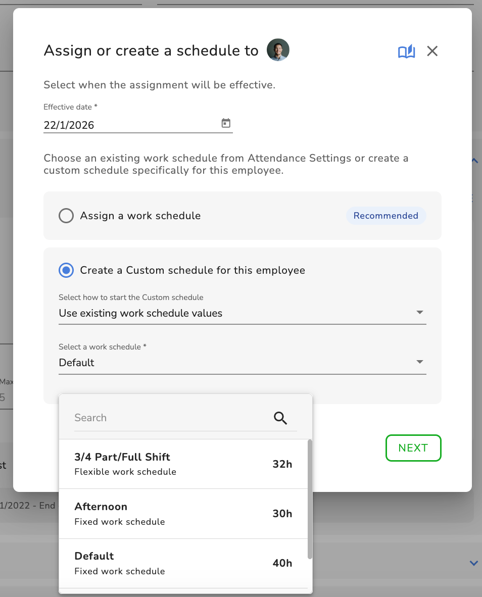- Définissez la date d’entrée en vigueur de ce planning de travail personnalisé pour cet employé
