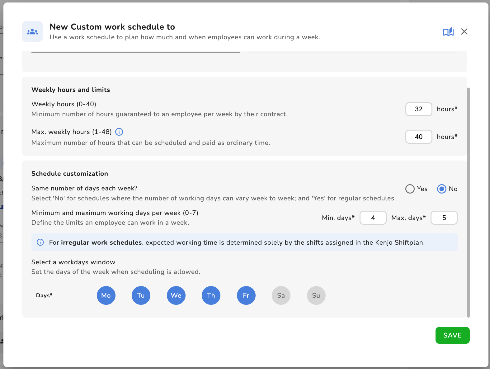 Configuration des jours travaillés : définit comment les heures hebdomadaires sont réparties sur les jours de travail sélectionnés. Elle propose trois méthodes principales pour définir les obligations de travail : | Pour ce planning de travail irrégulier, le temps de travail attendu est déterminé uniquement par les shifts dans le planning de travail Kenjo.