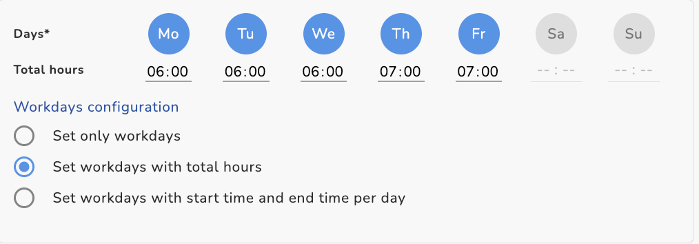 2. Impostare i giorni lavorativi con un totale di ore: Durata flessibile (Flextime): Il datore di lavoro definisce manualmente una durata totale di ore al giorno. I dipendenti hanno l’autonomia di scegliere i propri orari di inizio e fine, purché venga raggiunto l’obiettivo giornaliero di ore. ![]() | |