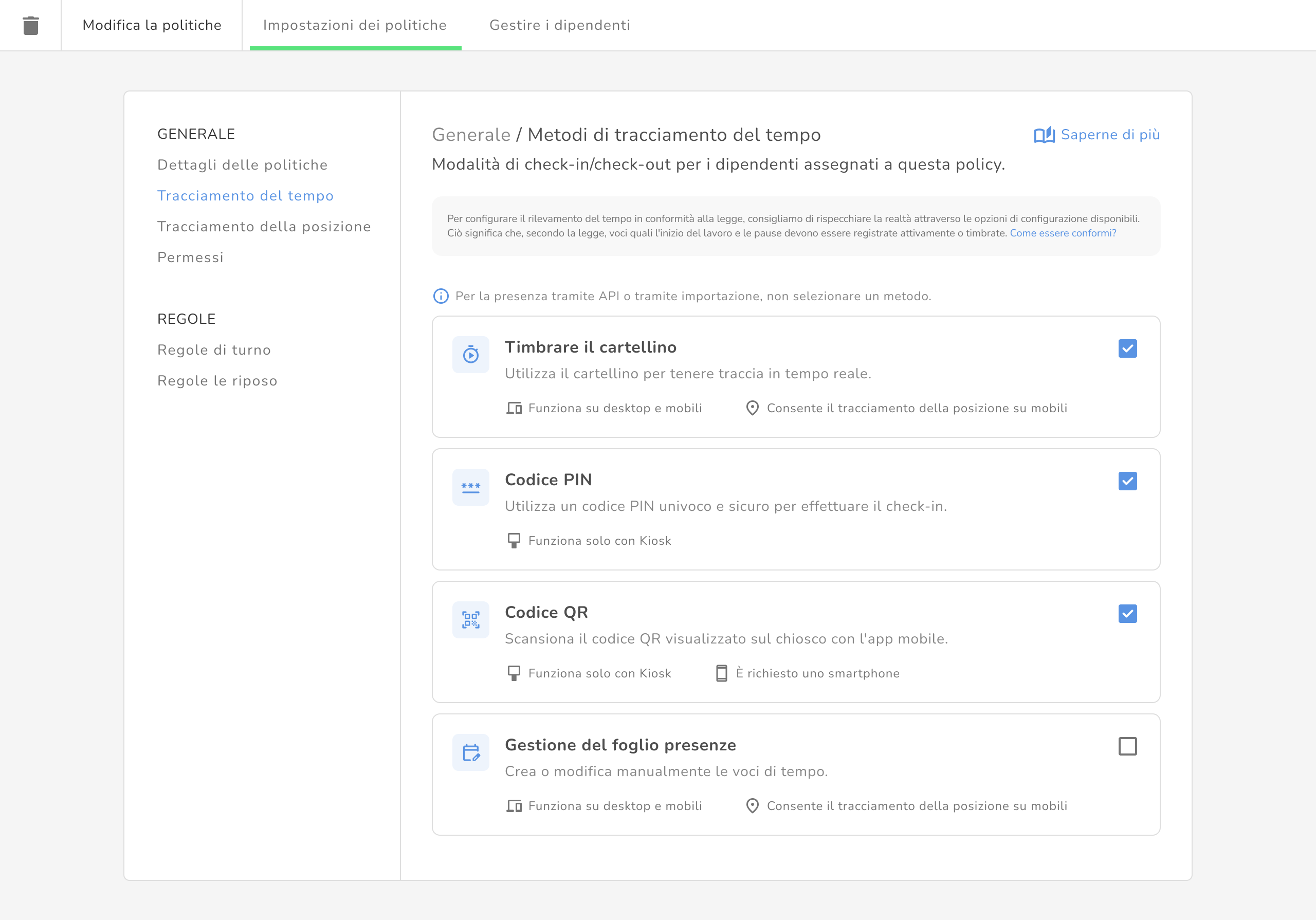 Se utilizzi o stai considerando di utilizzare il terminale di registrazione dell'orario, attiva nelle Presenza > Impostazioni > Politiche di Presenza > Tracciamento del tempo il metodo PIN Code o QR Code.