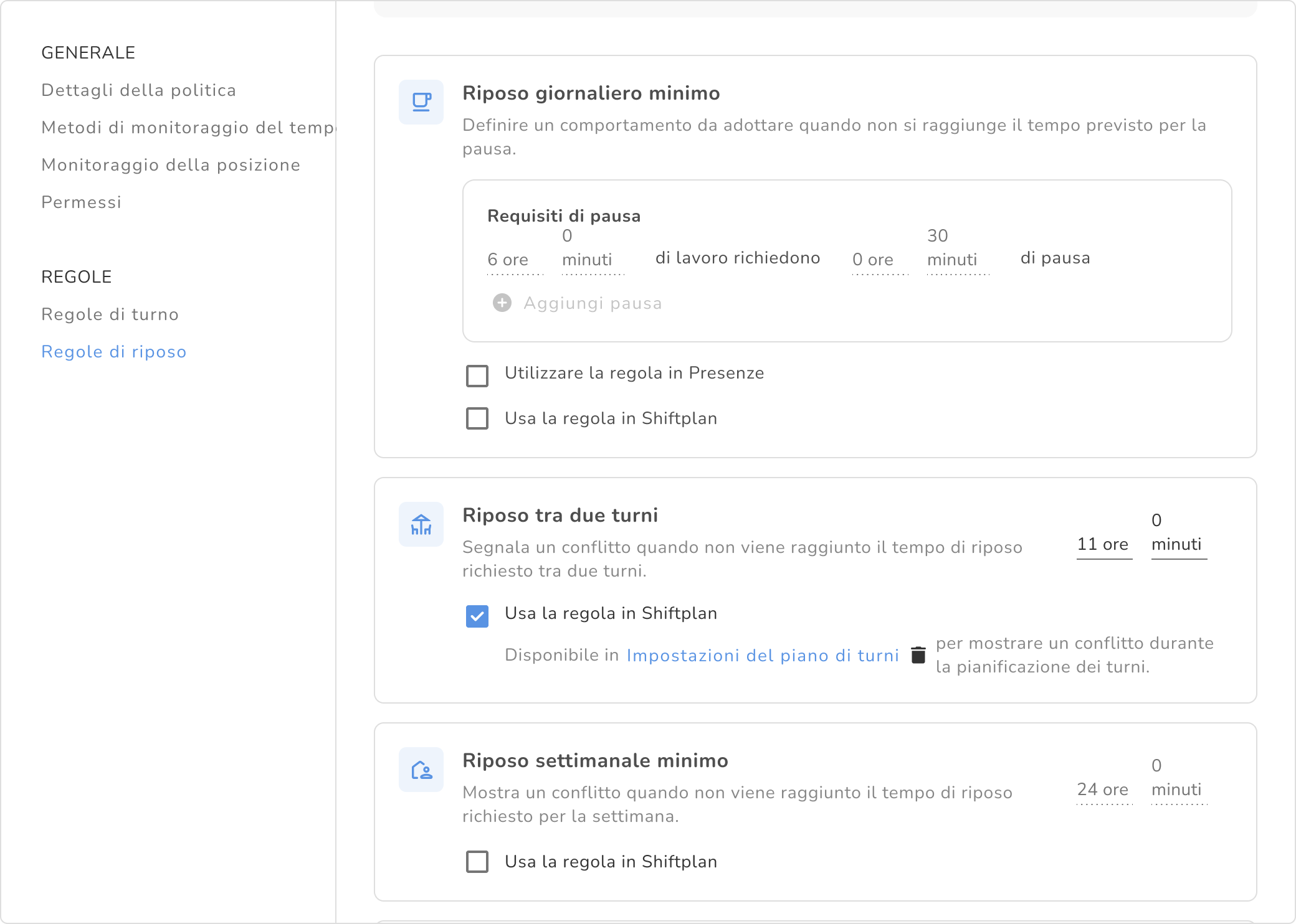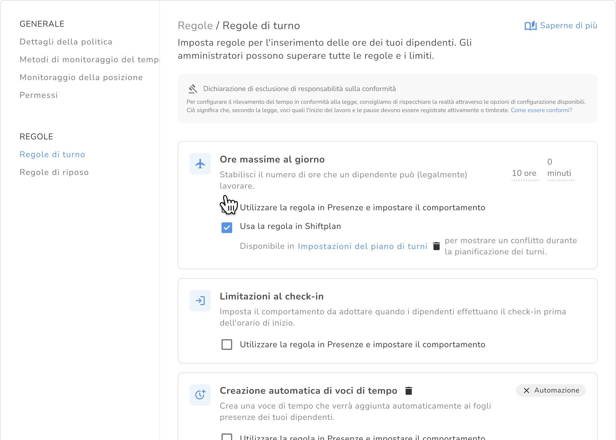 Per essere conformi è necessario definire Ore massime al giorno per tutti i dipendenti e bloccare i tuoi dipendenti dall'effettuare il check-in prima del loro orario di lavoro pianificato tramite Limitazioni su check-in.