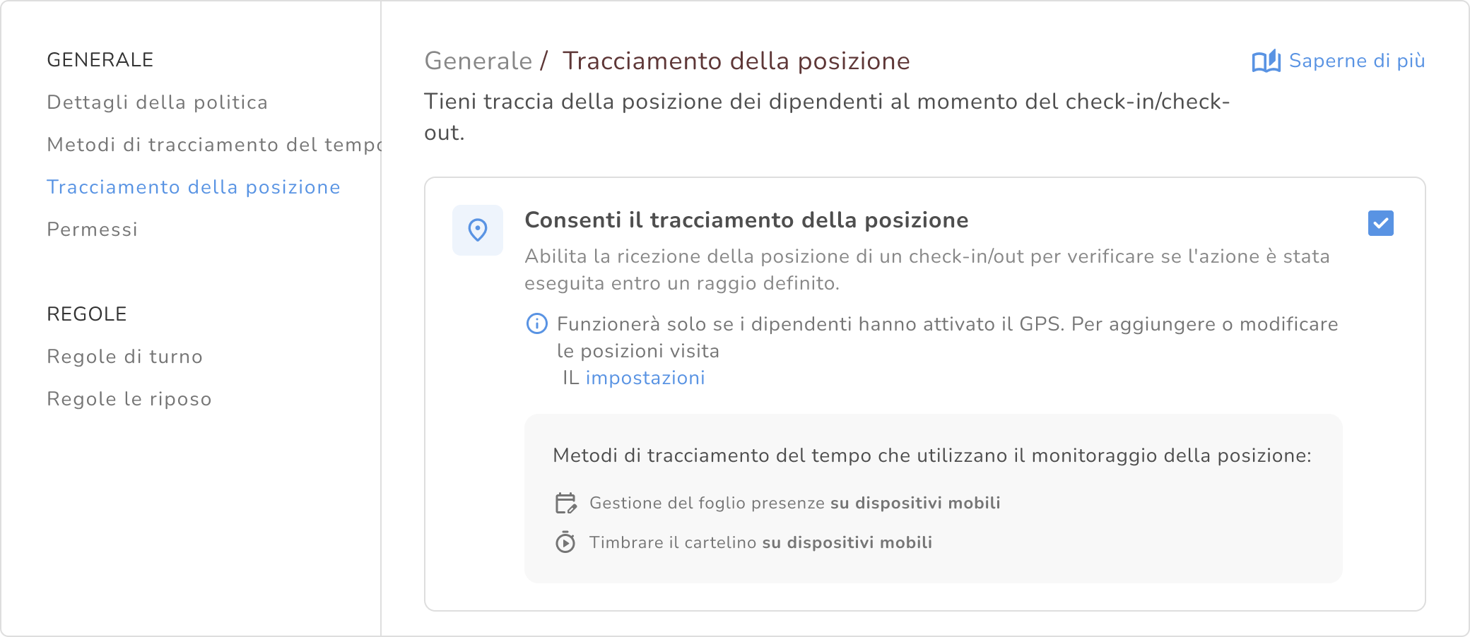 Questo non influisce sulla conformità alle normative, ma ti aiuta a capire da quali posizioni i tuoi dipendenti hanno iniziato il check-in/out.