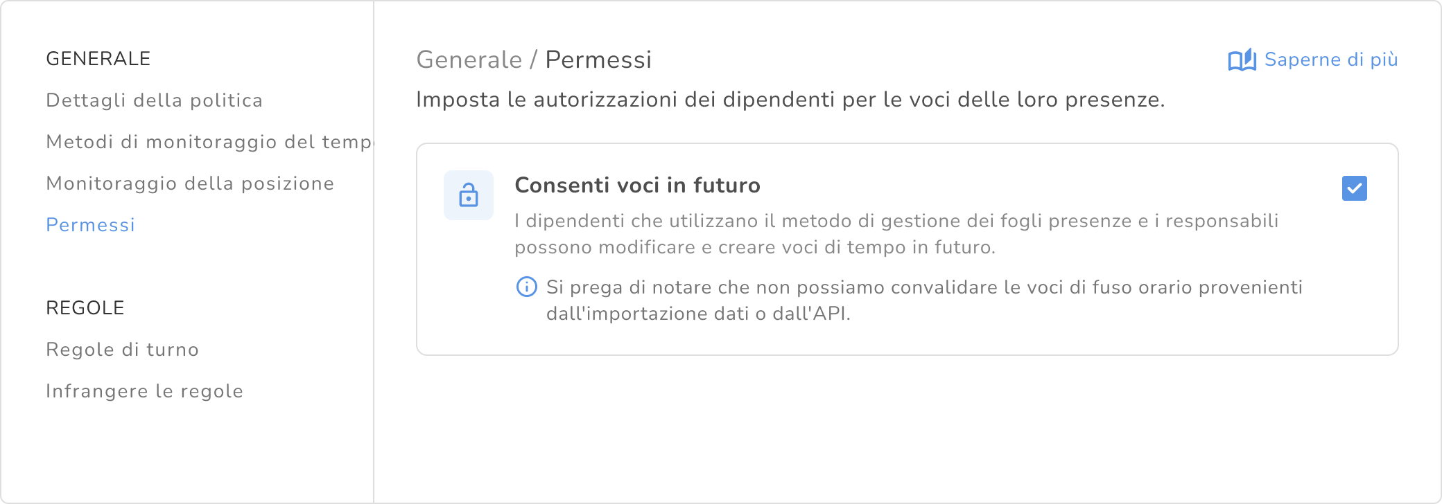 Attenzione! Aggiungere voci future non riflette la realtà. Consigliamo di utilizzare metodi di timbratura per riflettere la realtà ed essere conformi alla leggeRegole di riposo