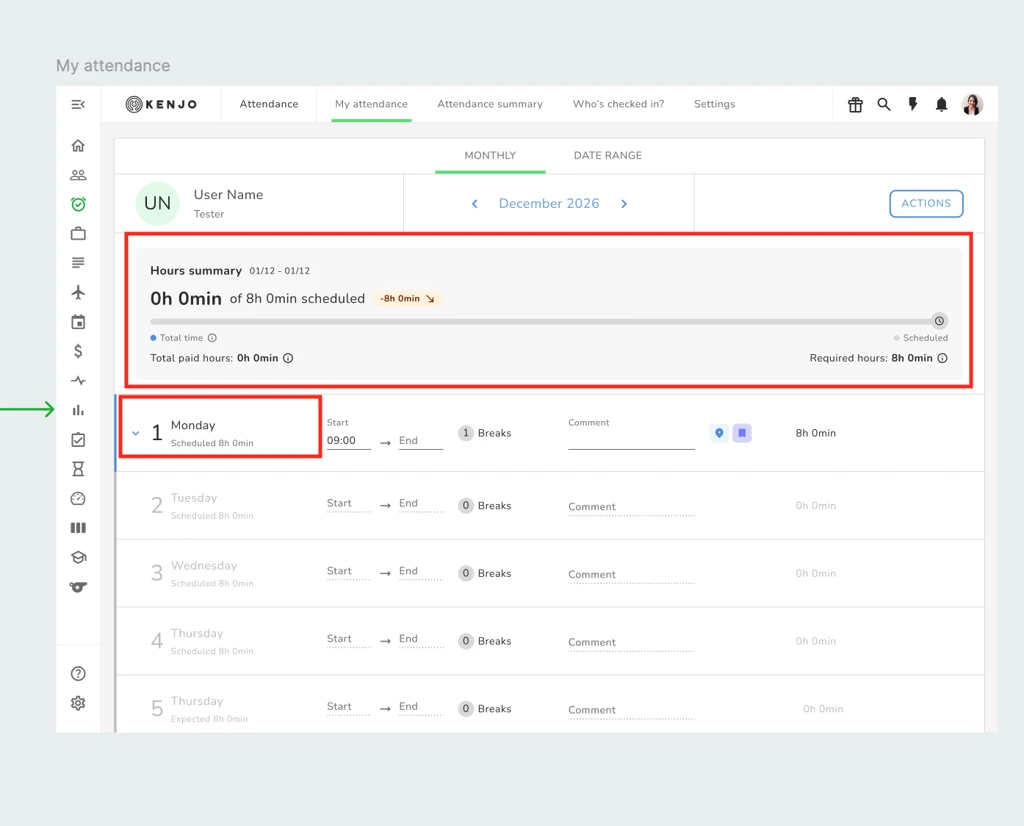 Alle Mitarbeiter sehen eine Stundenübersicht in Form eines großen Schiebereglers, der Folgendes anzeigt: